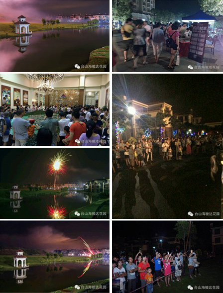 2014年10月1日,臺(tái)山海駿達(dá)花園舉行了國(guó)慶煙花匯演活動(dòng)。活動(dòng)當(dāng)晚人頭攢動(dòng),超過(guò)5000人次的市民到場(chǎng)觀看了此次煙花匯演,璀璨的煙花也一次次點(diǎn)燃大家的熱情。市民對(duì)掃二維碼拿禮品的活動(dòng)熱情高漲,商家展位前的美食及特色商品吸引了大多數(shù)市民駐足。手拿應(yīng)節(jié)風(fēng)車,品嘗特色美食,欣賞璀璨煙花,置身自然美景,參與活動(dòng)的市民都說(shuō)太享受了。